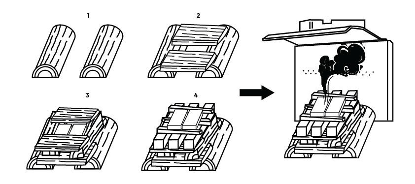 • On top of the logs, place firelighter and two additional smaller logs on each side. Then with your kindling, approx. 6-10 sticks create a Jenga type stack with gaps for air about 3-4 levels high. With another firelighter on top of this stack.